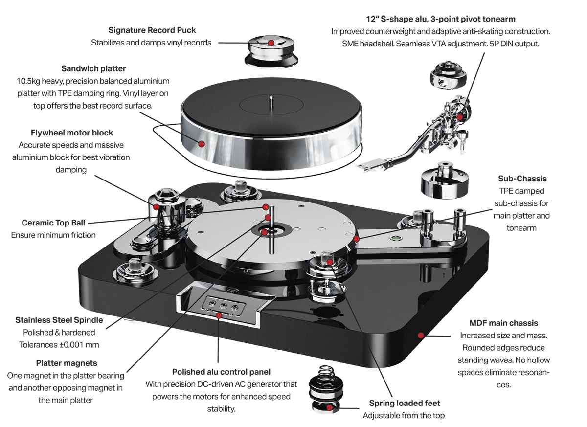I Signature 12 er tonearmen og tallerkenen montert på et TPE-dempet, resonansoptimalisert sub-chassis i en aluminiumslegering. Dette er et nytt skritt mot å separere tonearmen og tallerkenen fra det massetunge, fjærbelastede hovedchassiset og motorblokken.