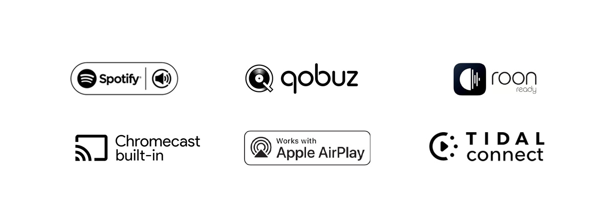 Strøm alt du måtte ønske via populære tjenester som Tidal Connect, Spotify Connect, Qobuz, TuneIn, Deezer, Amazon Music m.fl., eller bruk Airplay 2, Chromecast Audio om du ønsker det.